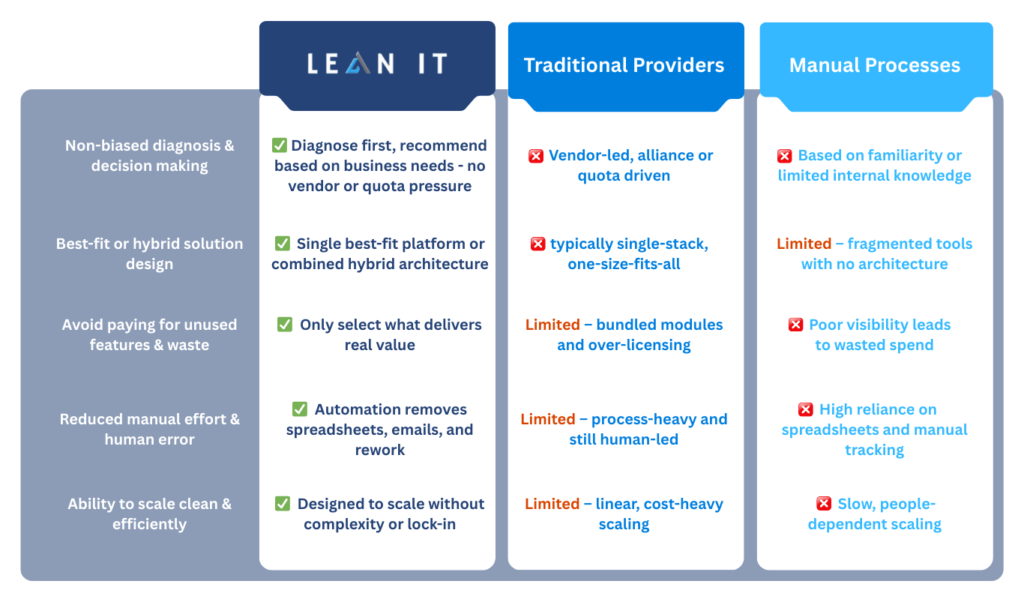 Unlike traditional providers tied to a single technology stack, Lean IT has the freedom to diagnose and recommend a single optimal platform or architect a best-in-class hybrid ecosystem, by intelligently blending the strongest capabilities across platforms.